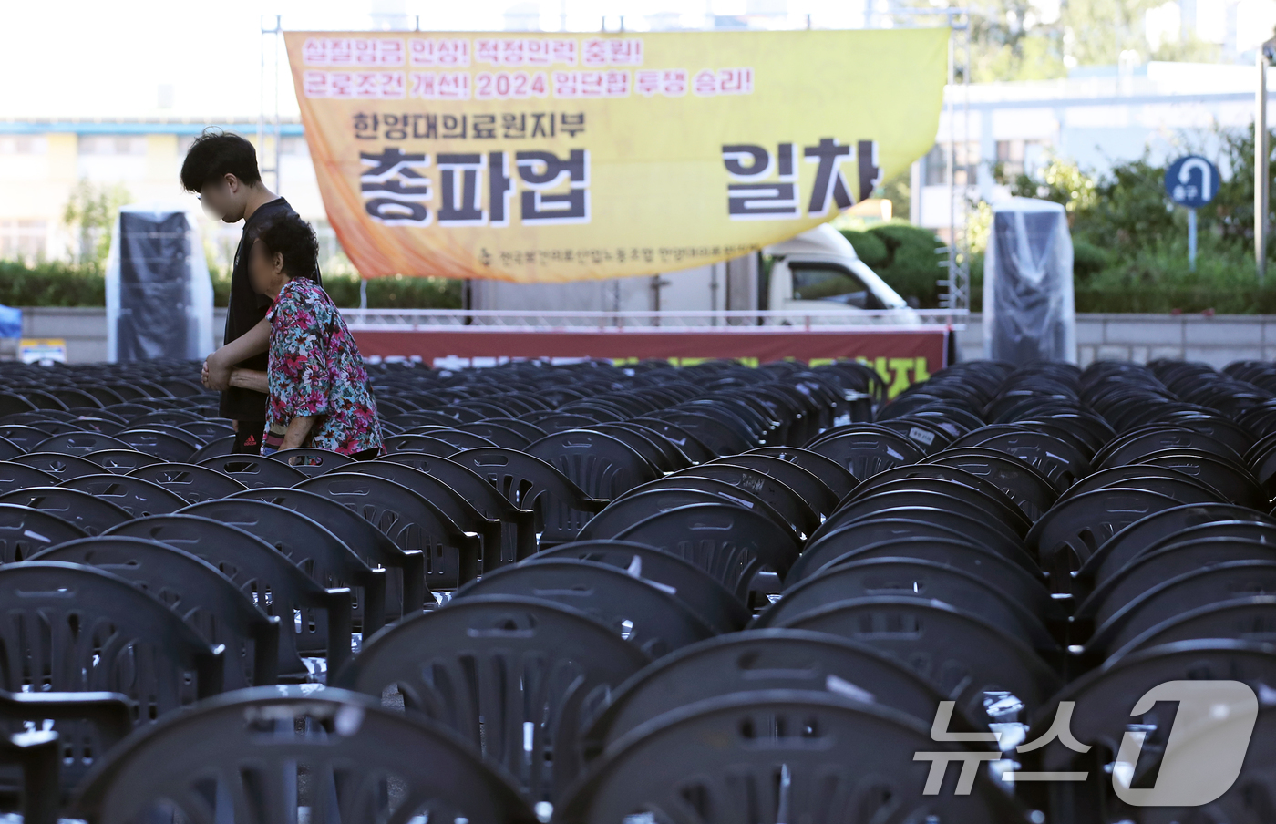 (서울=뉴스1) 오대일 기자 = 보건의료노조가 총파업을 사실상 철회한 29일 오전 서울 성동구 한양대병원에서 한 환자와 보호자가 파업 독려 현수막이 걸린 노조의 총파업 행사장 사이 …